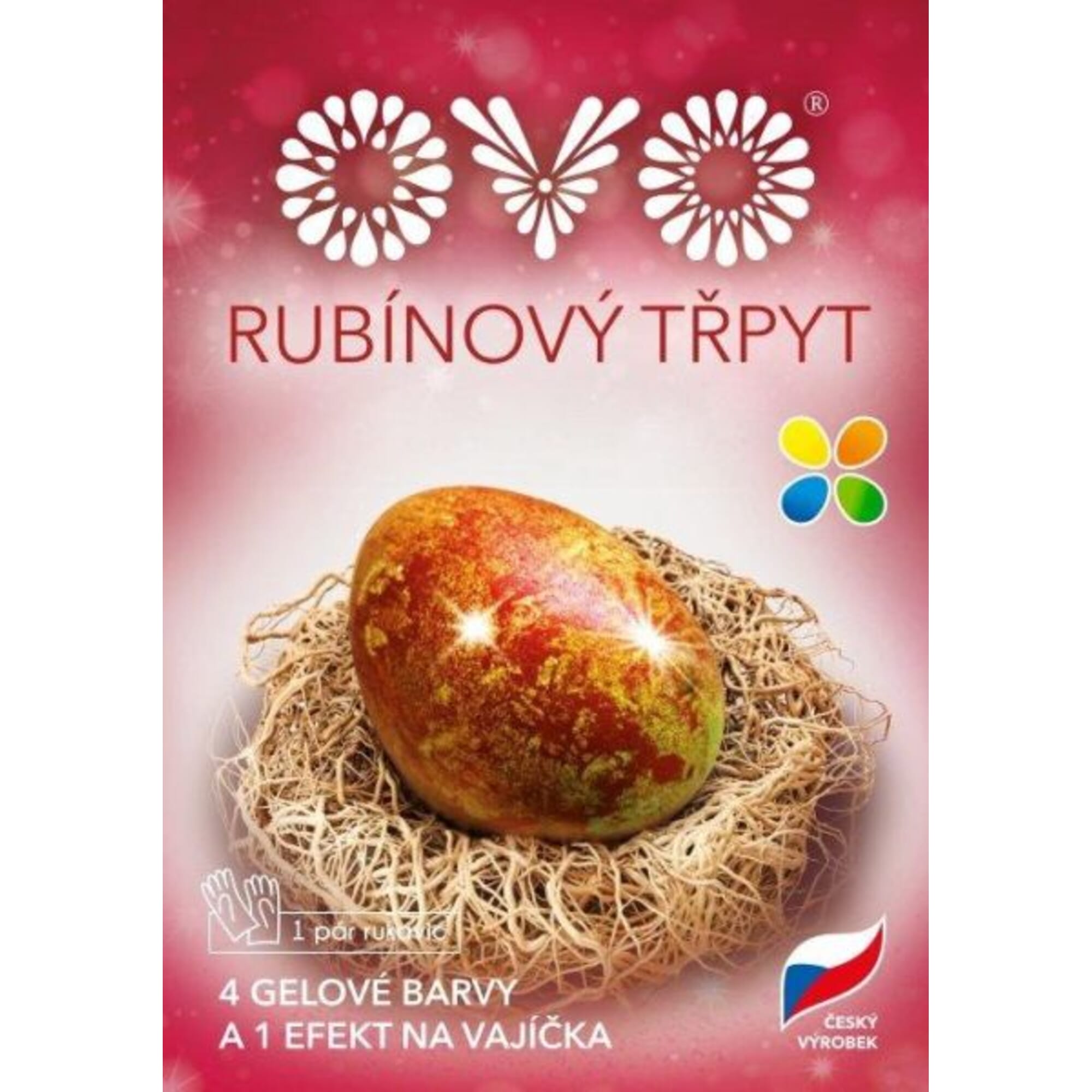- Kastītē 4 gēla krāsas (dzeltena, zila, zaļa, oranža) + 1 krāsa ar rubīna efektu un cimdu pāris.