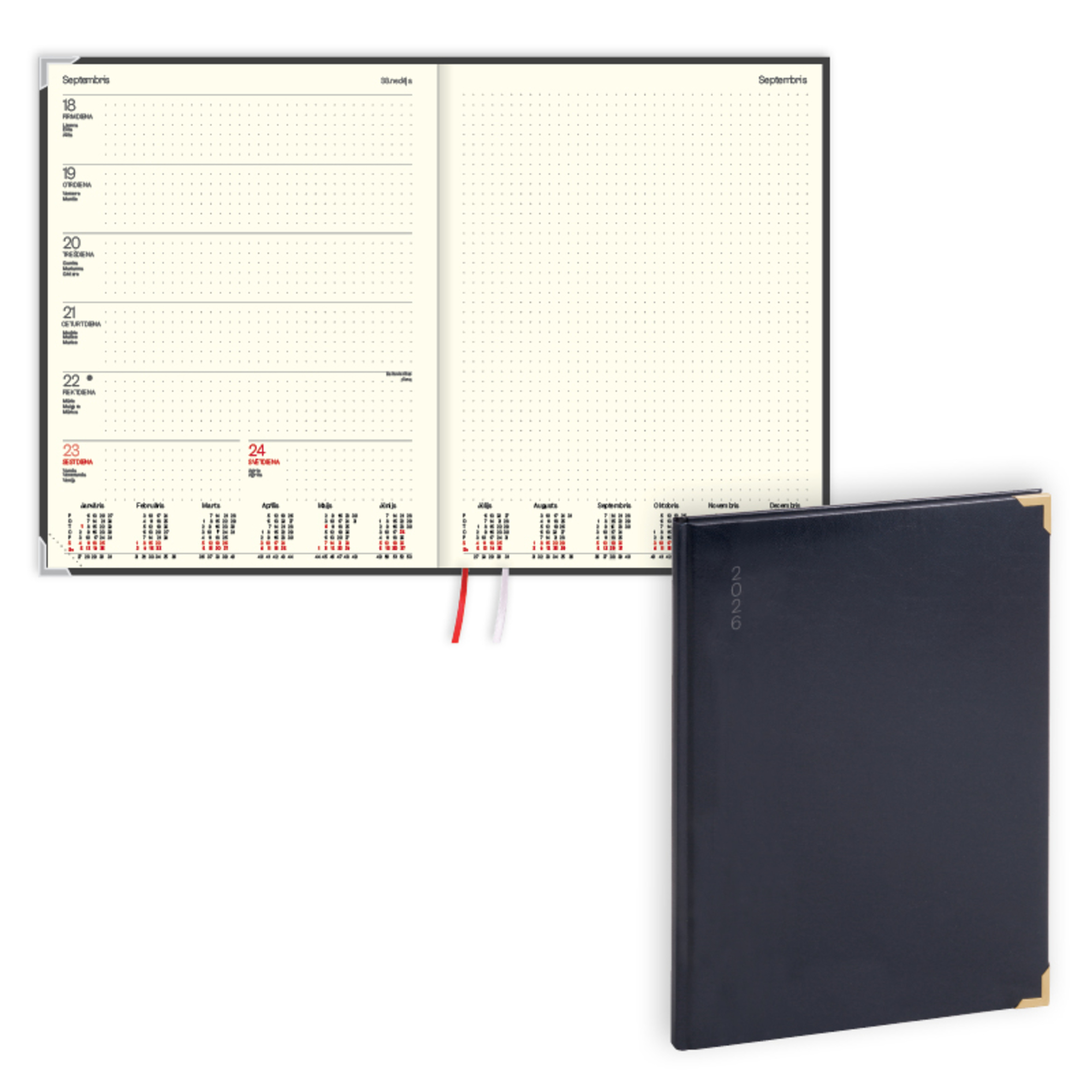 - Dienasgrāmata ar nedēļas atvērumu un vietu papildus piezīmēm.